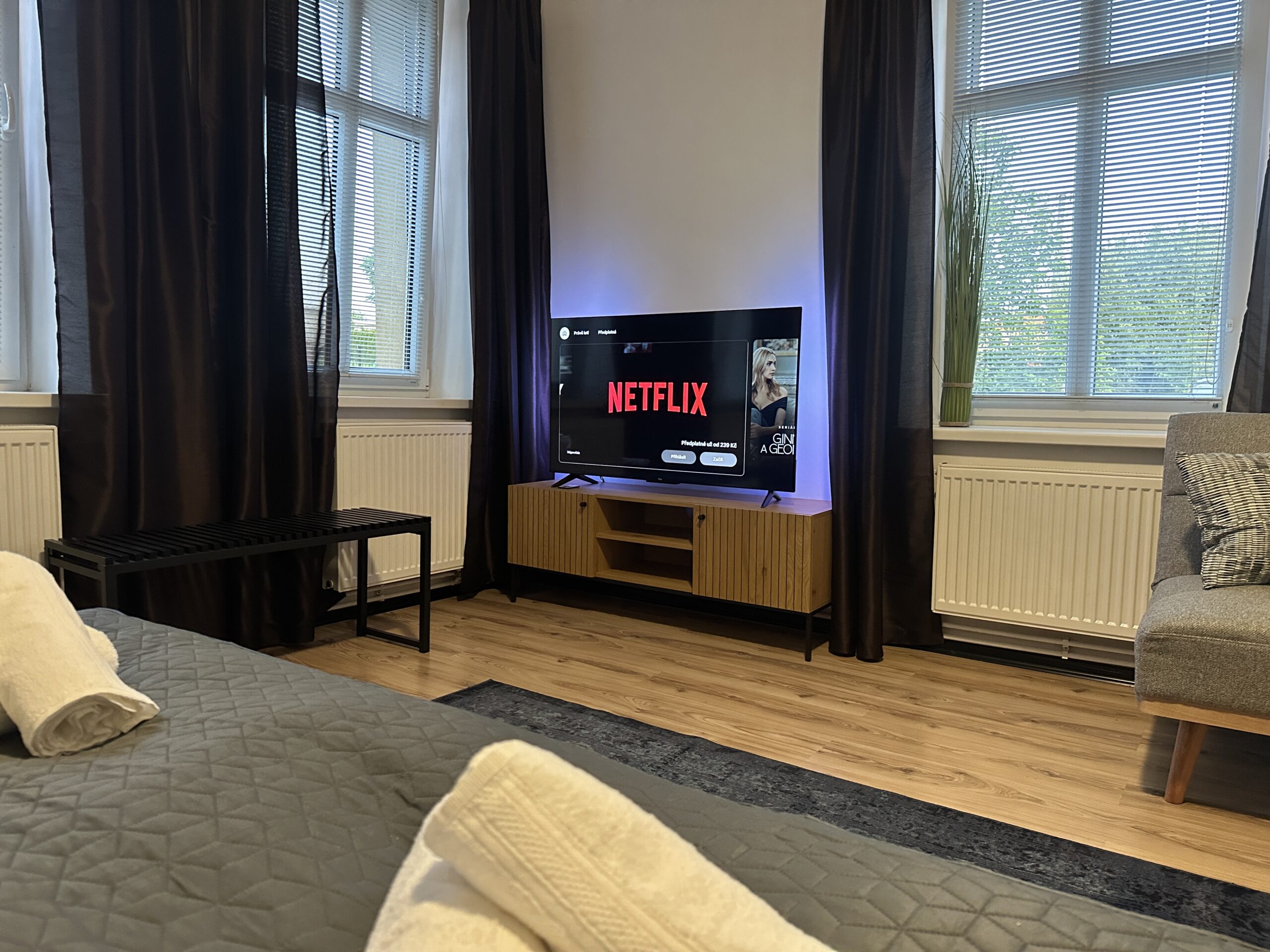 Moderní a prostorný apartmán o velikosti 62 m² nabízí dvě ložnice, každou s vlastní velkou TV s plochou obrazovkou, plně vybavenou kuchyň, pohodlný obývací prostor a koupelnu se sprchou. Ubytování je ideální pro rodiny nebo skupiny až 5 osob. Samozřejmostí je Wi-Fi zdarma, výhled do zahrady, kávovar, fén a všechny základní potřeby v ceně. Díky klidné lokalitě a kompletnímu vybavení se zde budete cítit jako doma – ať už přijíždíte na víkend, nebo delší pobyt.