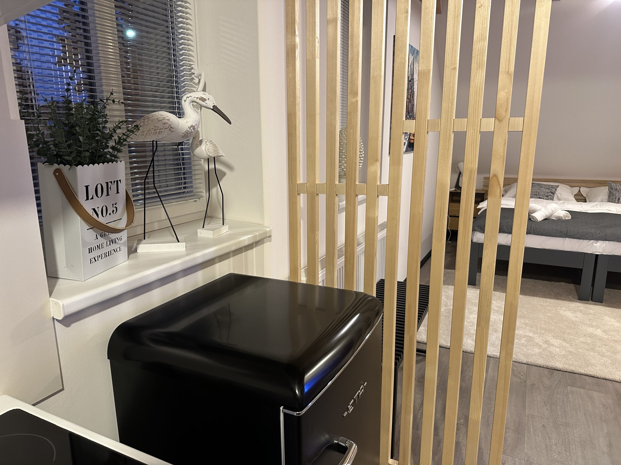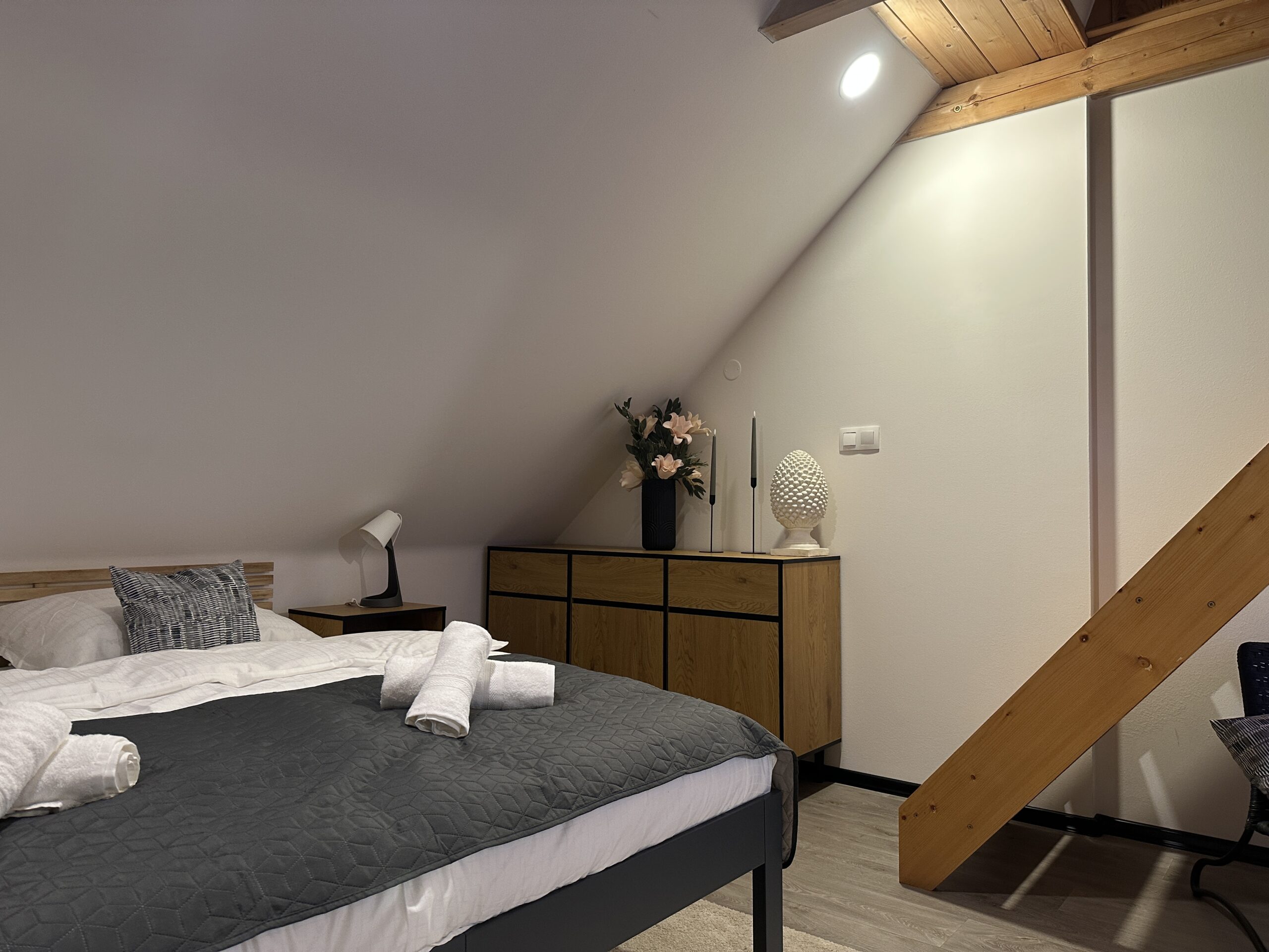 Moderní a klimatizovaný apartmán o rozloze 45 m² nabízí dvě ložnice, plně vybavenou kuchyň, vlastní koupelnu se sprchou a pohodlný obývací prostor. K dispozici jsou dvě ložnice, každá s vlastní TV s plochou obrazovkou. Nechybí Wi-Fi zdarma, kávovar, trouba, varná deska, žehlička ani bezpečnostní prvky jako detektor oxidu uhelnatého. Interiér s dřevěnými stropy působí útulně a stylově. Apartmán je ideální pro páry, rodiny i menší skupiny do 4 osob, které hledají pohodlí a klid.